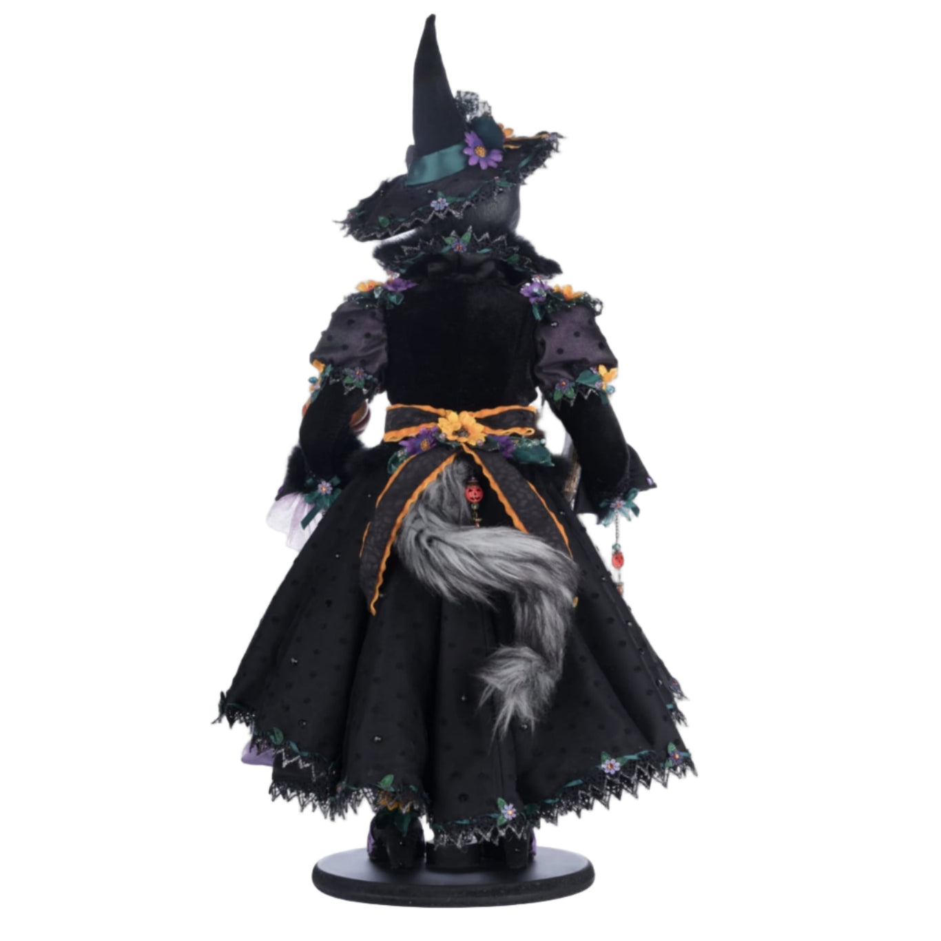 Purr-L Blacktail features a hand-painted resin cat head, custom-designed clothing adorned with jeweled floral embellishments, and a posable fur tail for lifelike character. In one paw, she holds a handcrafted paper maché book, and in the other, a hand-painted pumpkin wand—capturing the spirit of Halloween storytelling and magic.