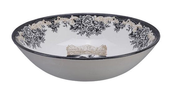 These pieces feature a queen with her skull. There is a beautiful black and gold floral print around the rim.